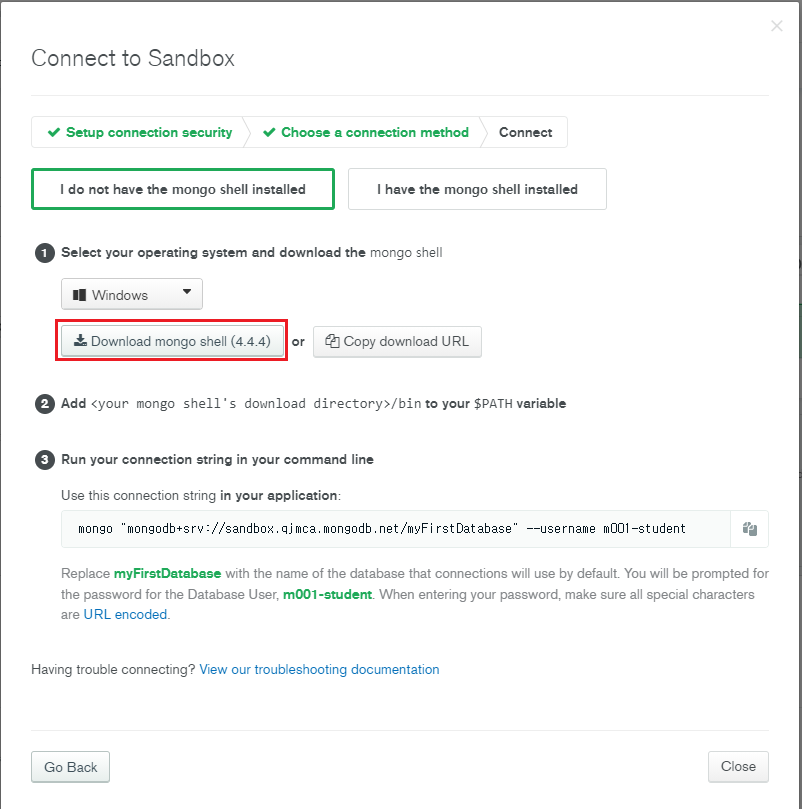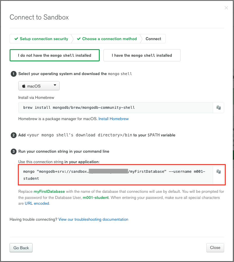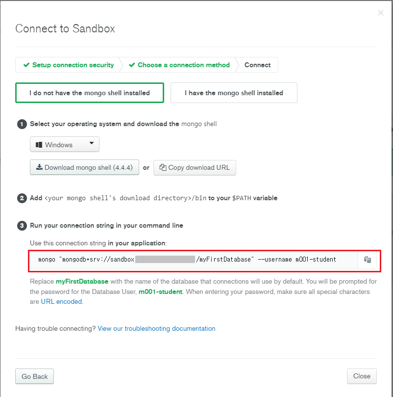 $ mongo "mongodb+src://[url]/admin" --username m001-student
