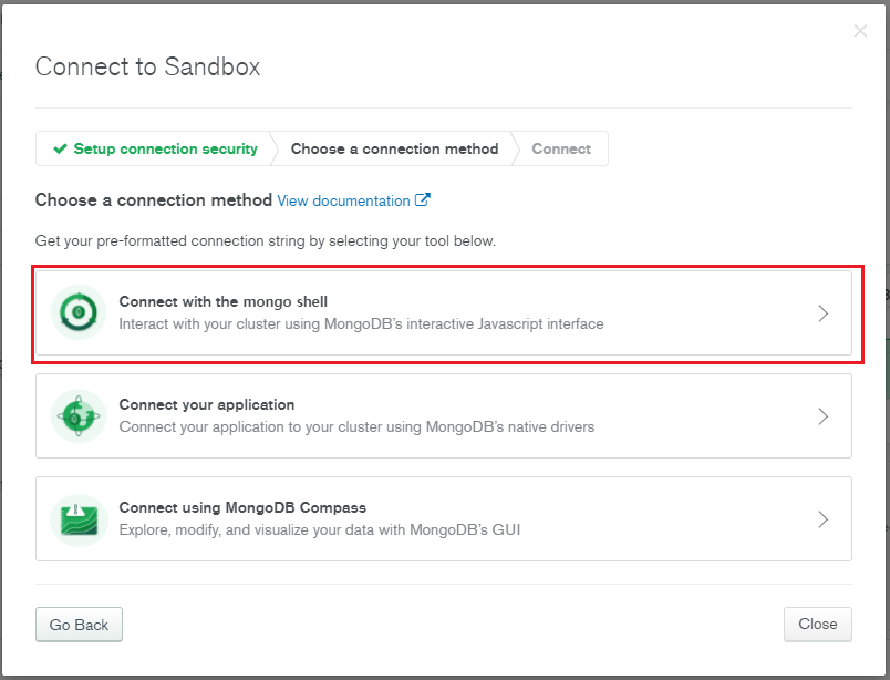 Connect with the mongo shell 버튼을 누르면 접속을 하는 방법이 자세하게 설명되어 있습니다.