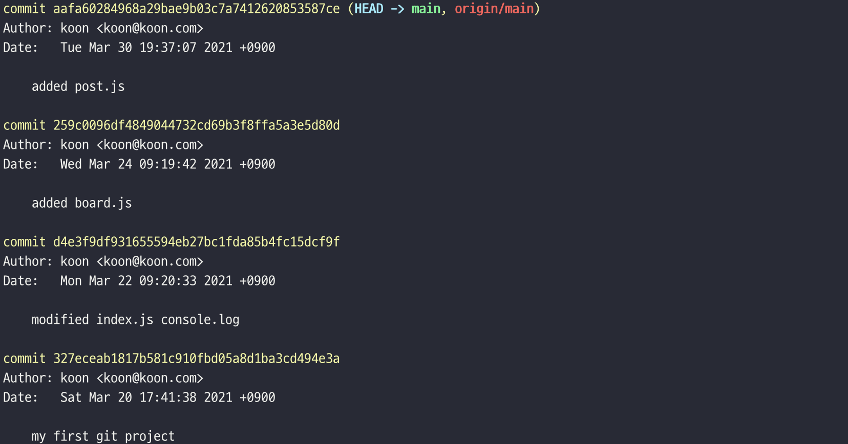 로그에도 정상적으로 post.js와 메세지가 추가된 것을 알 수 있습니다. 그럼 다시 이 branch를 GitHub에 업로드해보도록 하겠습니다.