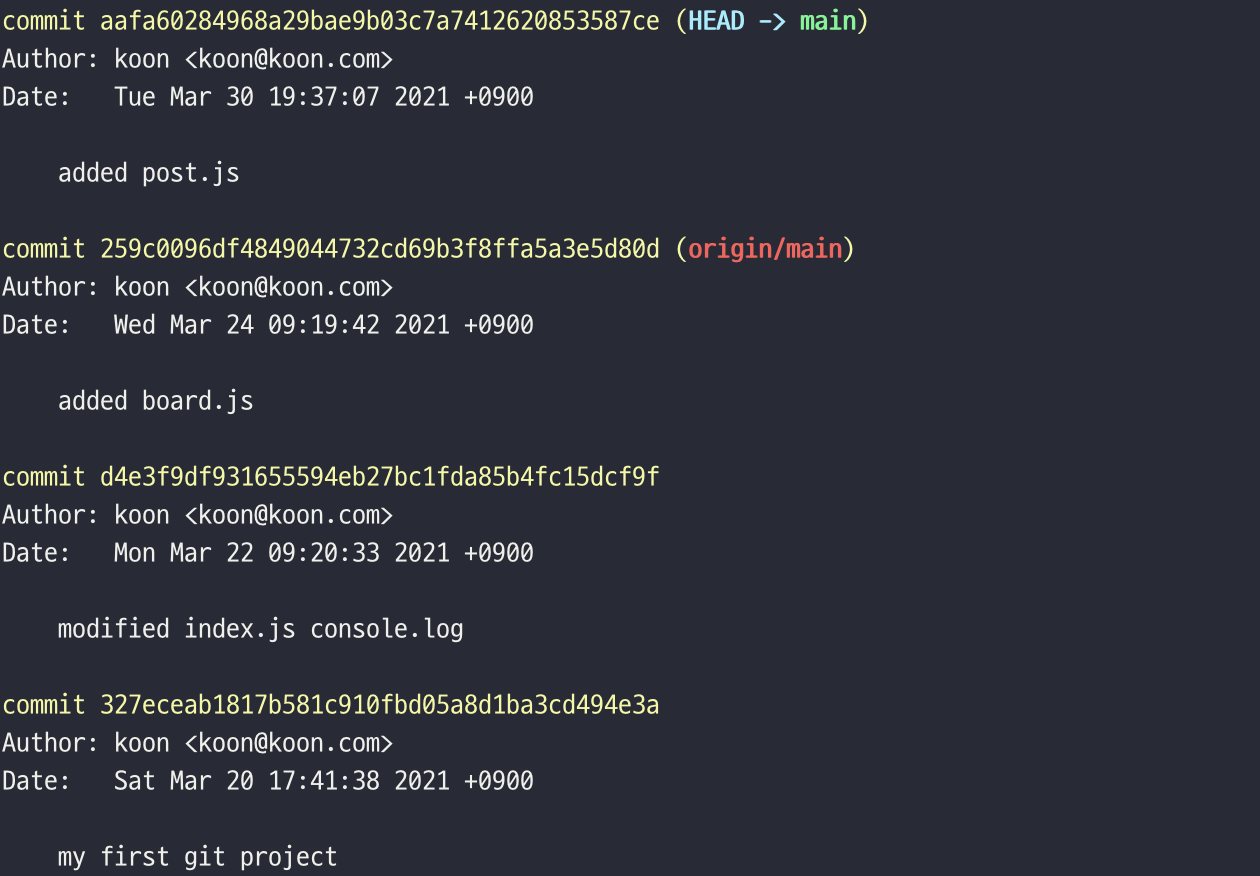 로그로 확인해보면 현재의 branch와 github의 branch가 동일한 곳을 가리키고 있음이 확인됩니다.