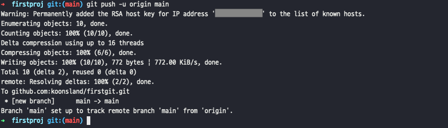 git push가 정상적으로 동작했다면 몇 개의 파일이 push 되었고 현재 branch가 어딘지 나타납니다. 로그로 확인해 보겠습니다.