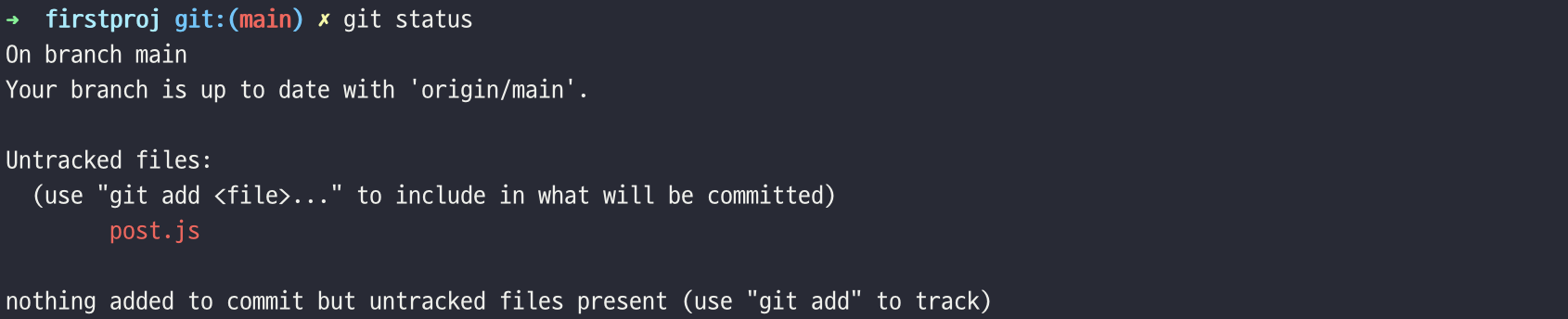현재 작업 디렉토리에는 새로운 파일 post.js가 만들어졌습니다. 그럼 git의 현재 상태를 확인해 보도록 하겠습니다.