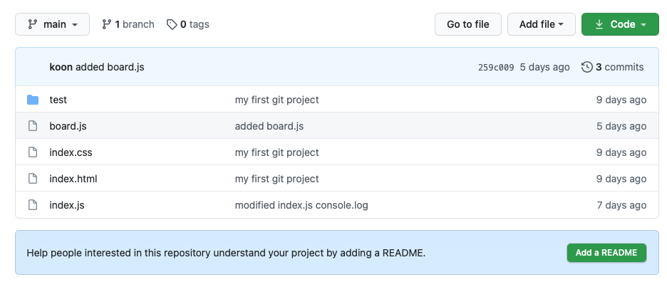 그러면 이번에는 새로운 파일을 생성해서 add 하고 commit 이후에 push까지 일괄적으로 진행해 보겠습니다.
