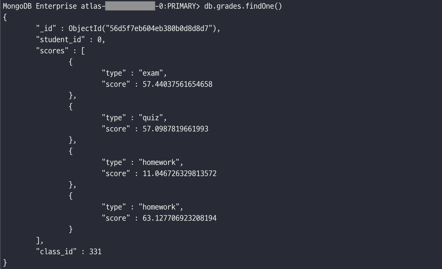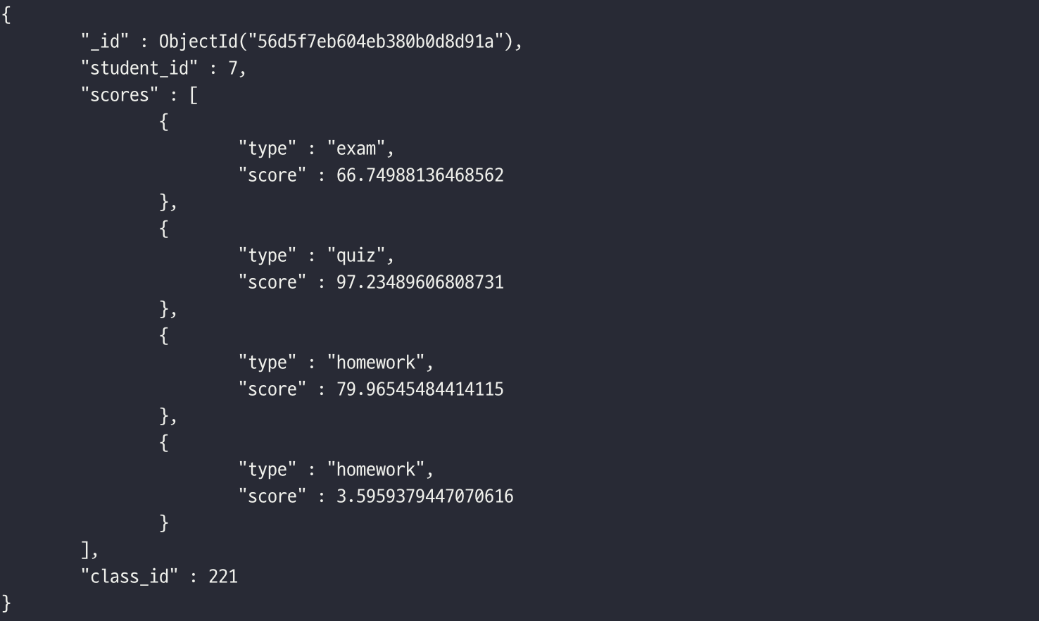 저는 grades 라는 collections을 검색해 보았습니다. scores라는 키에 해당하는 값이 배열(Arrays)의 형태로 저장되어 있는 것을 확인하실 수 있습니다.