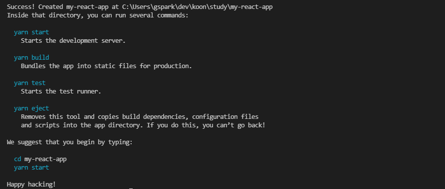 Windows라면 CMD에서, Linux 혹은 macOS에서는 쉘에서 입력하시면 됩니다. Node.js가 정상적으로 설치가 되어 있다면 react 관련 패키지들이 설치가 될 것입니다.