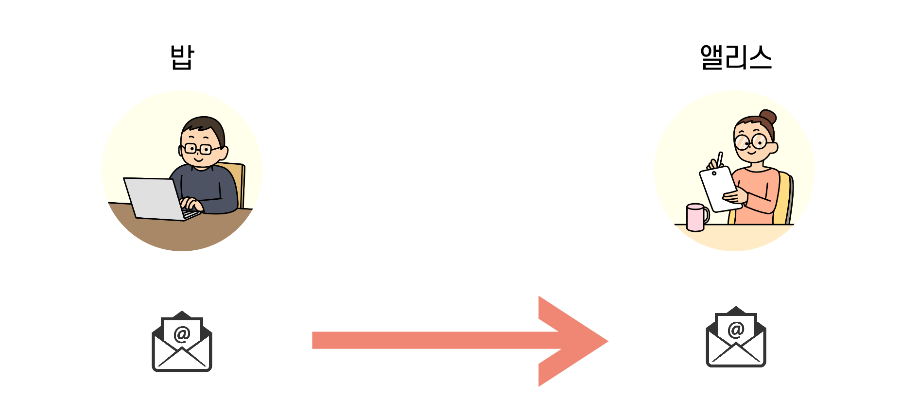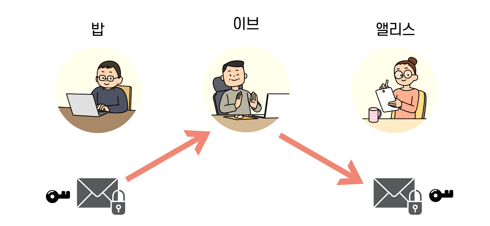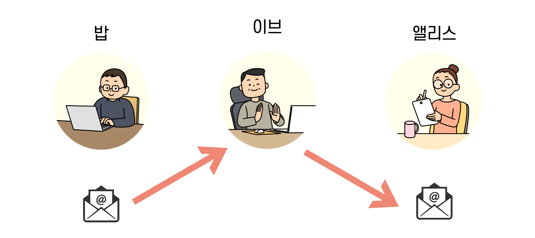 그리고 암호관련 설명을 하기 위해서는 앨리스와 밥이라는 가상의 인물이 등장합니다. 이는 영어에서 Alice, Bob 으로 알파벳 순서대로 이름이 지어진 것으로 보시면 될것 같네요.