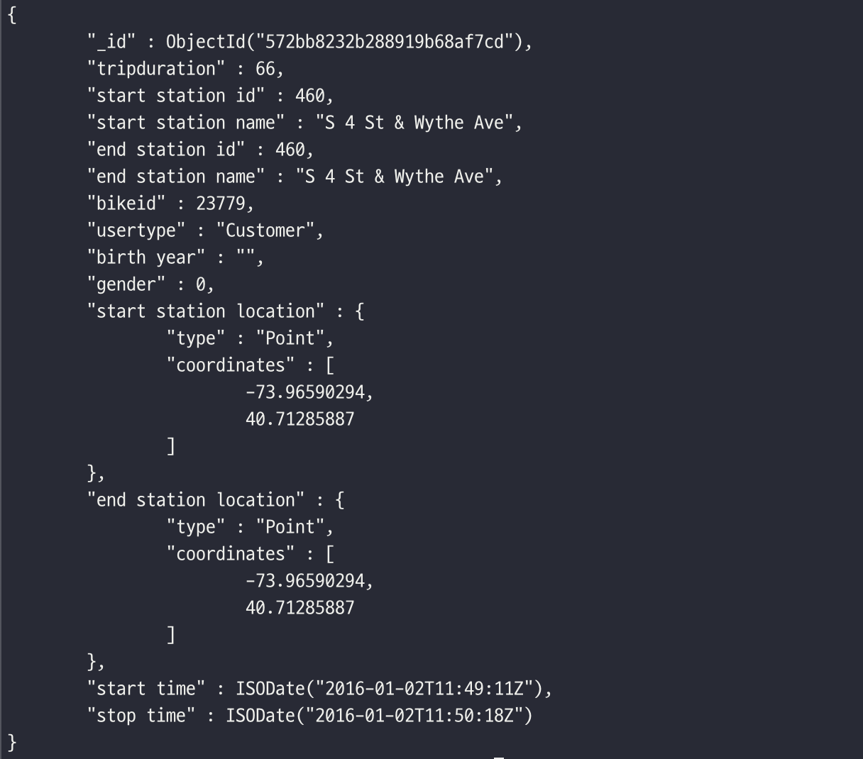 우선 trips라는 collection에서 검색을 하도록 할게요. 여행기간(tripduration)은 적어도 70일보다는 작고 usertype이 Subscriber가 아닌 데이터를 가져오려 합니다.