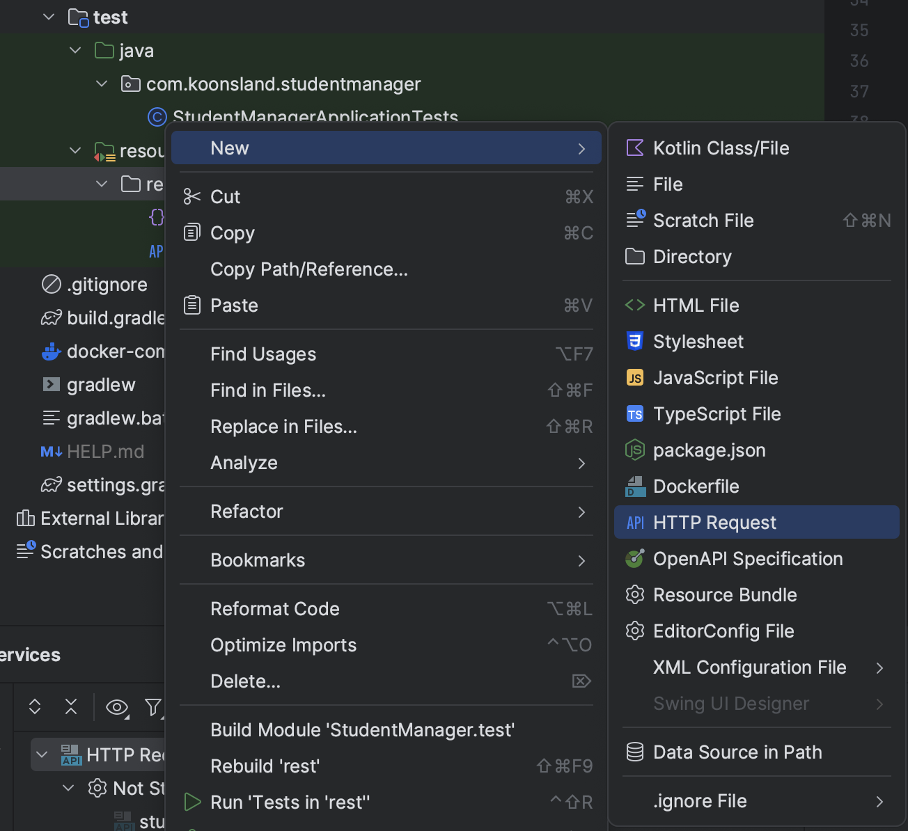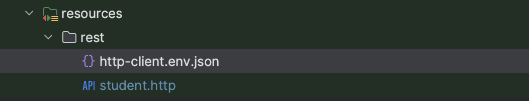 test > resources > rest 라는 폴더를 만들고 여기에 'HTTP Request'라는 파일을 생성해 준다. 파일이름은 아무거나 상관없지만 확장자는 반드시 '.http'로 생성해 준다.