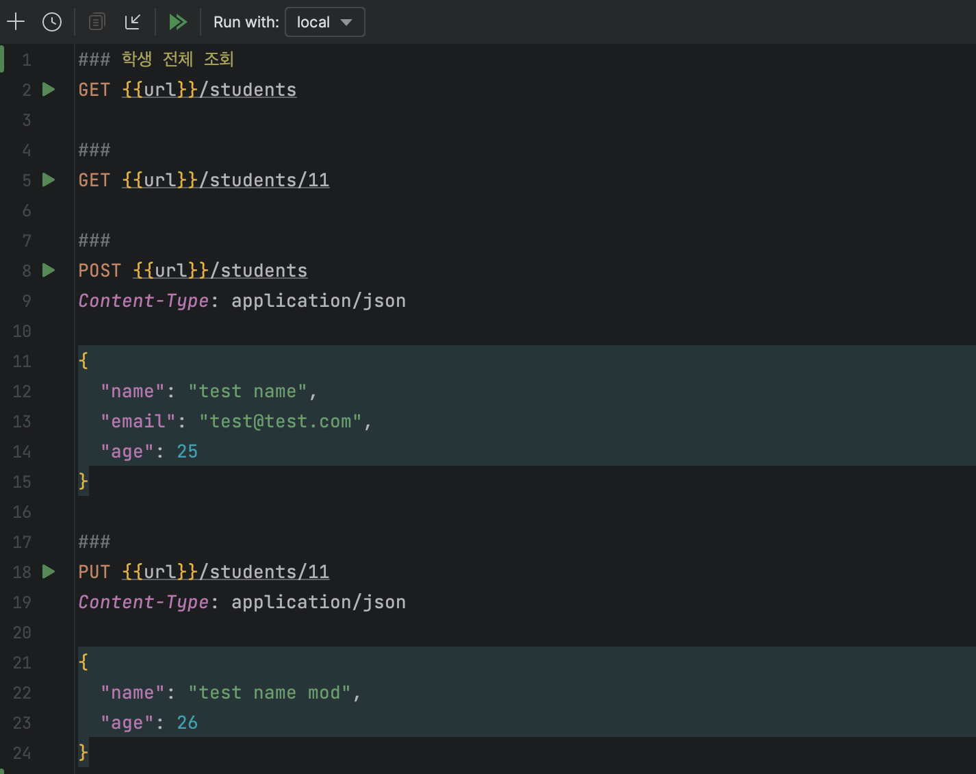 이 경우 환경은 local 환경이라는 의미이며, 로컬환경을 선택했을 때 url이라는 값은 localhost:8080이라는 값으로 대체할 수 있게 된다. 그러면 다시 테스트를 해보자.