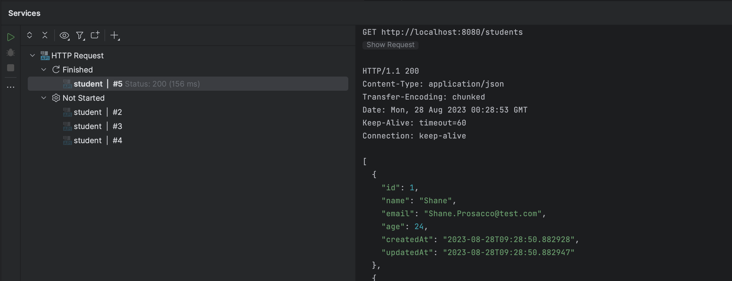 실행하면 요청에 대한 결과가 바로 IntelliJ 하단에 나타난다.