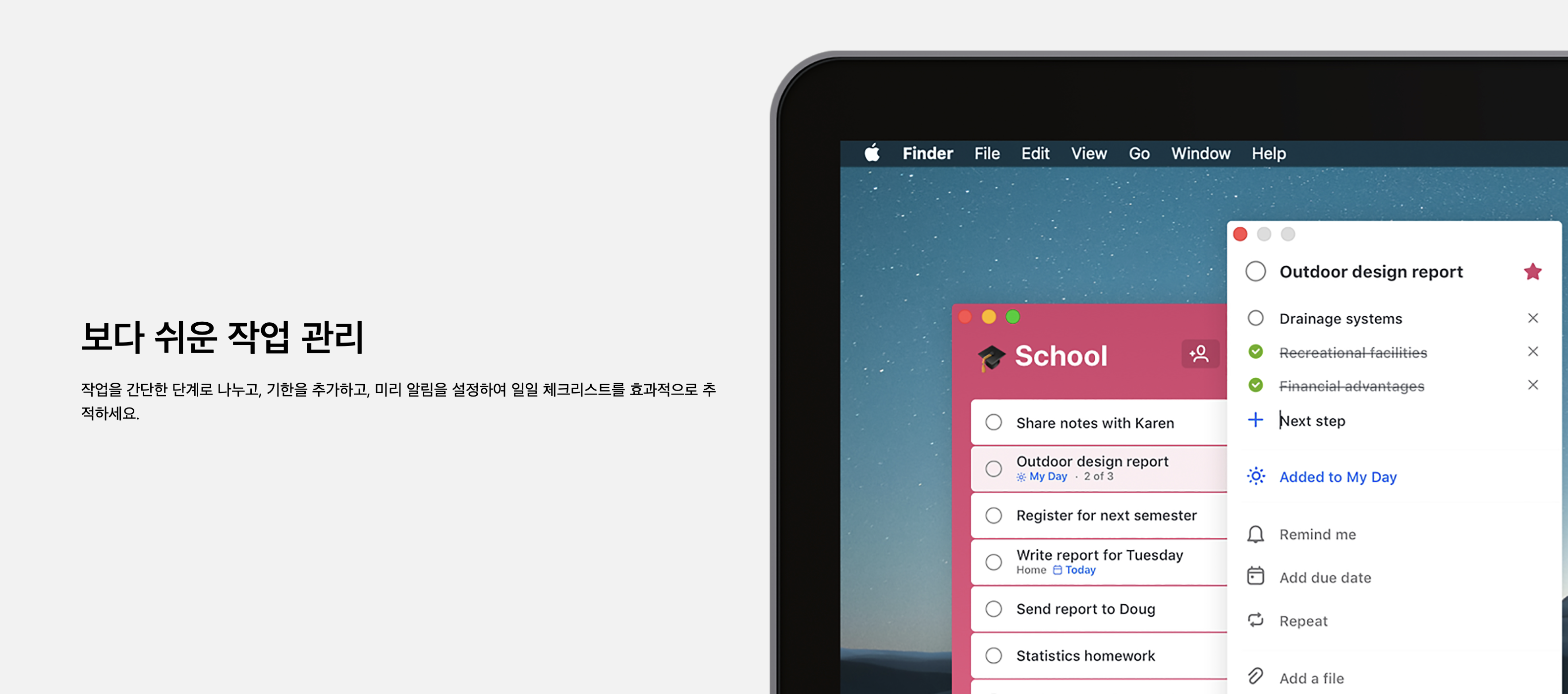 주요 기능으로는 작업 추가, 리스트 관리, 기한 설정, 알림 설정, Microsoft 365 앱과의 통합입니다.