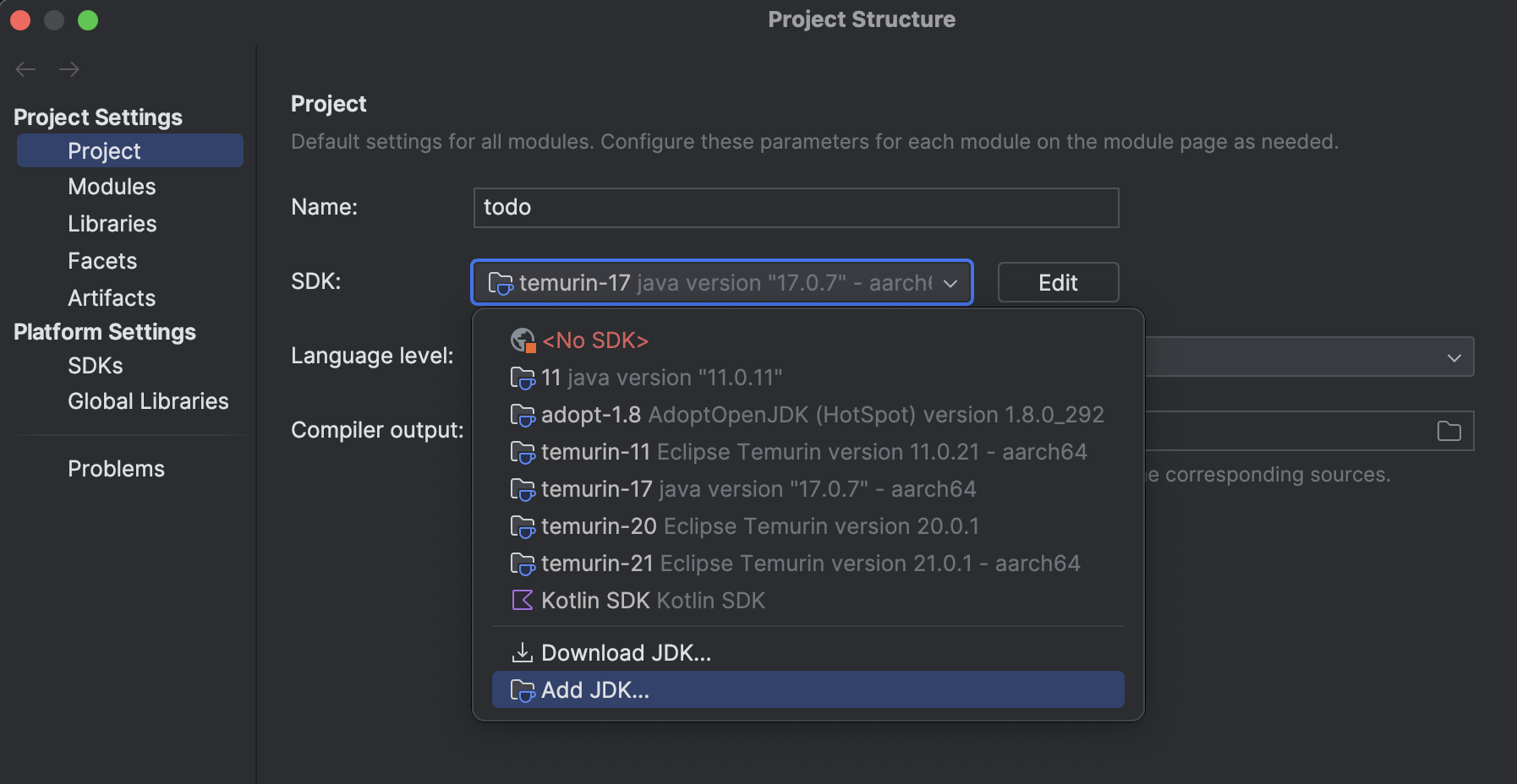 Mac의 M1 종류의 프로세서를 사용하고 있다면 aarch64가 붙은 JDK 버전을 다운로드 해서 설정해주시면 됩니다.