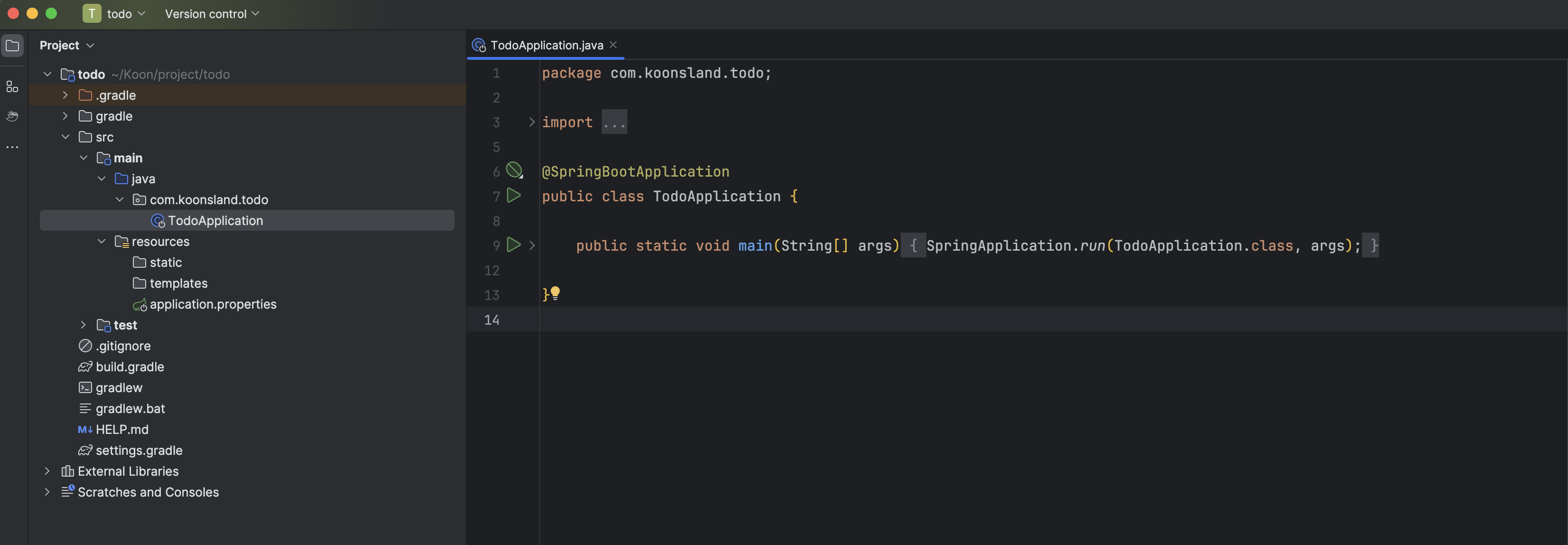 프로젝트 설정이 완료되었으므로, 이제 프로젝트를 실행하기 위해 초기 설정이 올바르게 되었는지 확인합니다. IntelliJ IDEA에서 /src/main/java의 'com.koonsland.todo' 패키지 내의 TodoApplication 클래스를 찾아 열어줍니다.