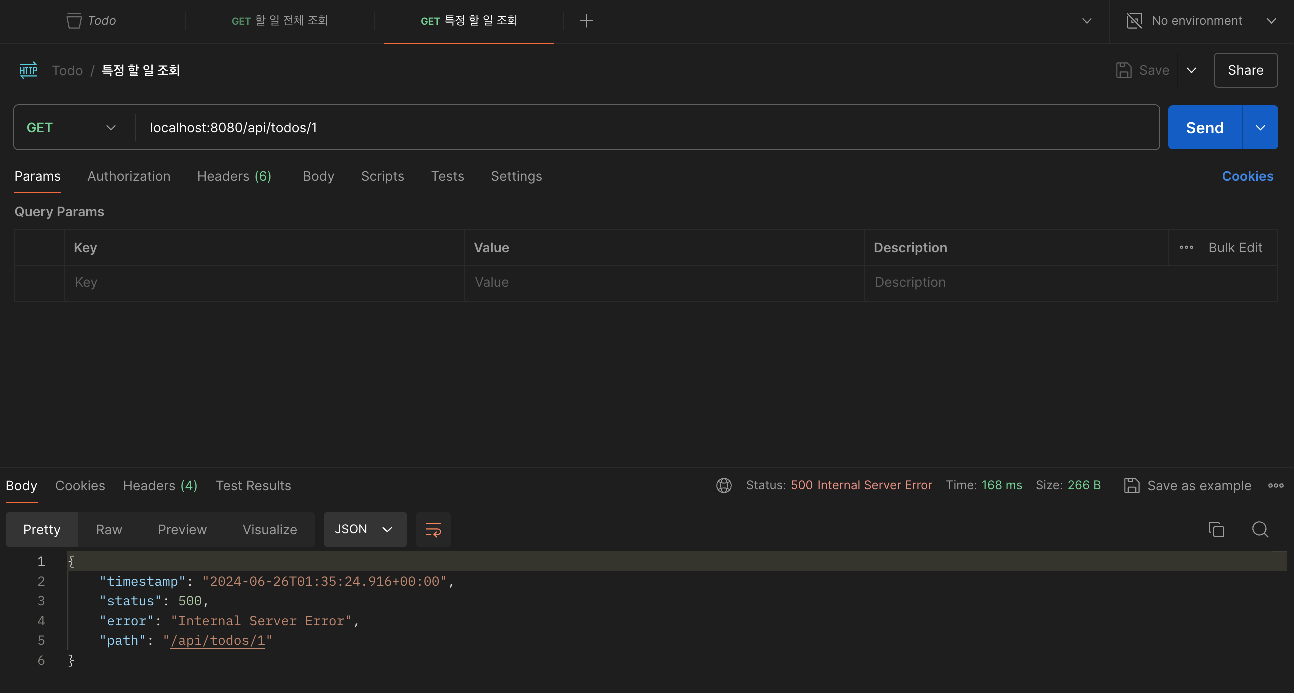 메서드는 GET이며 주소는 localhost:8080/api/todos/{id}로 입력하고 Send 버튼을 누르면 아래 Status: 500 Internal Server Error 와 같이 출력되며 에러가 나는 상황을 볼 수 있습니다. 데이터가 없기 때문에 NoSucElementException의 결과입니다. 서버 로그을 보면 다음과 같이 출력됩니다.