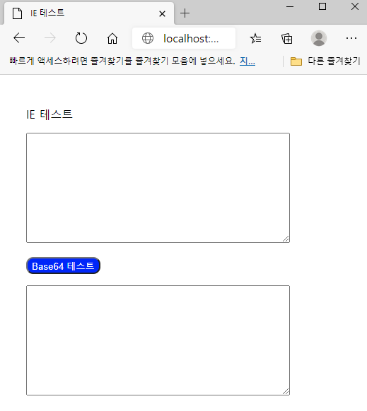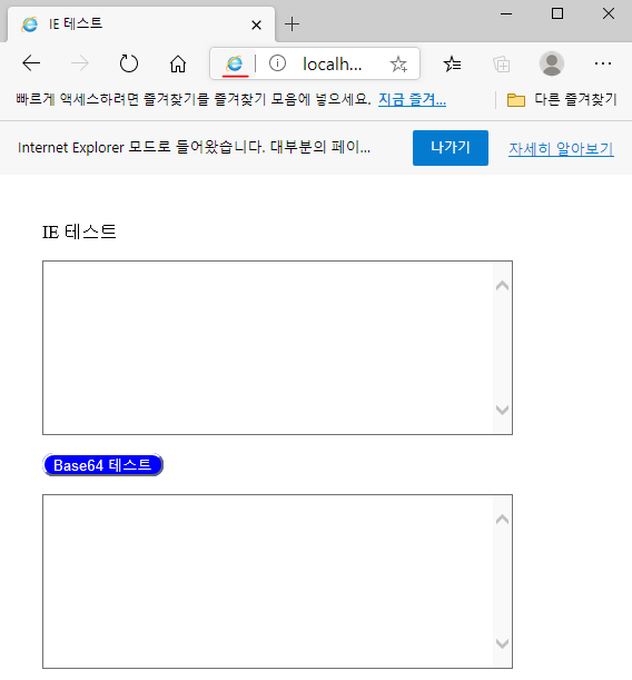 ▲ IE 모드로 동작하게 되면 상단에 아이콘도 IE 앱 모양으로 변경됩니다. 여기서는 액티브엑스가 정상적으로 동작함을 확인하기 위해서 Base64 테스트를 해보았습니다.