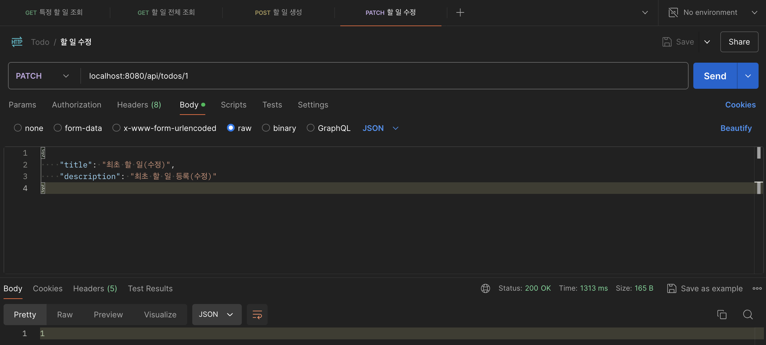메서드는 PATCH이며 주소는 localhost:8080/api/todos/1로 입력하고 Body 값을 추가로 입력해 줍니다. Body는 raw형태의 JSON으로 설정하고 아래와 같이 입력해 줍니다.
