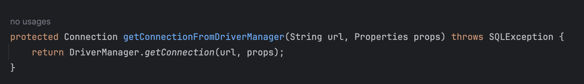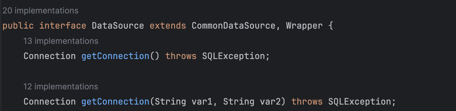 다음은 DataSource 인터페이스를 구현한 DriverManagerDataSource에서 getConnection() 메서드를 @Override 하여 기능을 구현합니다.