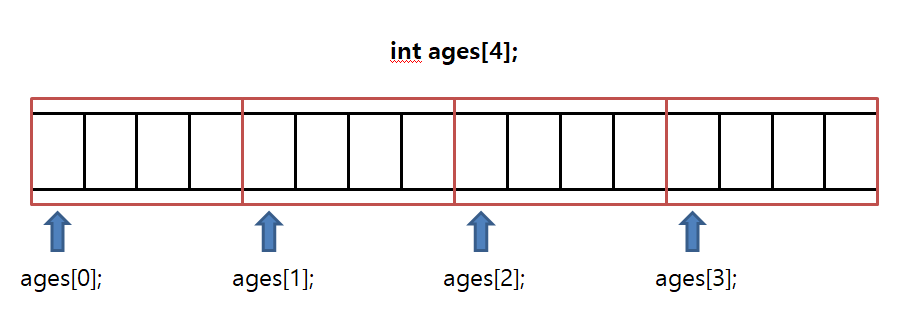 int 자료형은 크기가 4bytes 입니다. 따라서 1byte 4개를 한 묶음으로 생각하시면 됩니다. 그리고 이렇게 4개가 선언되었으므로 총 16bytes 크기를 ages 변수가 가지게 됩니다.