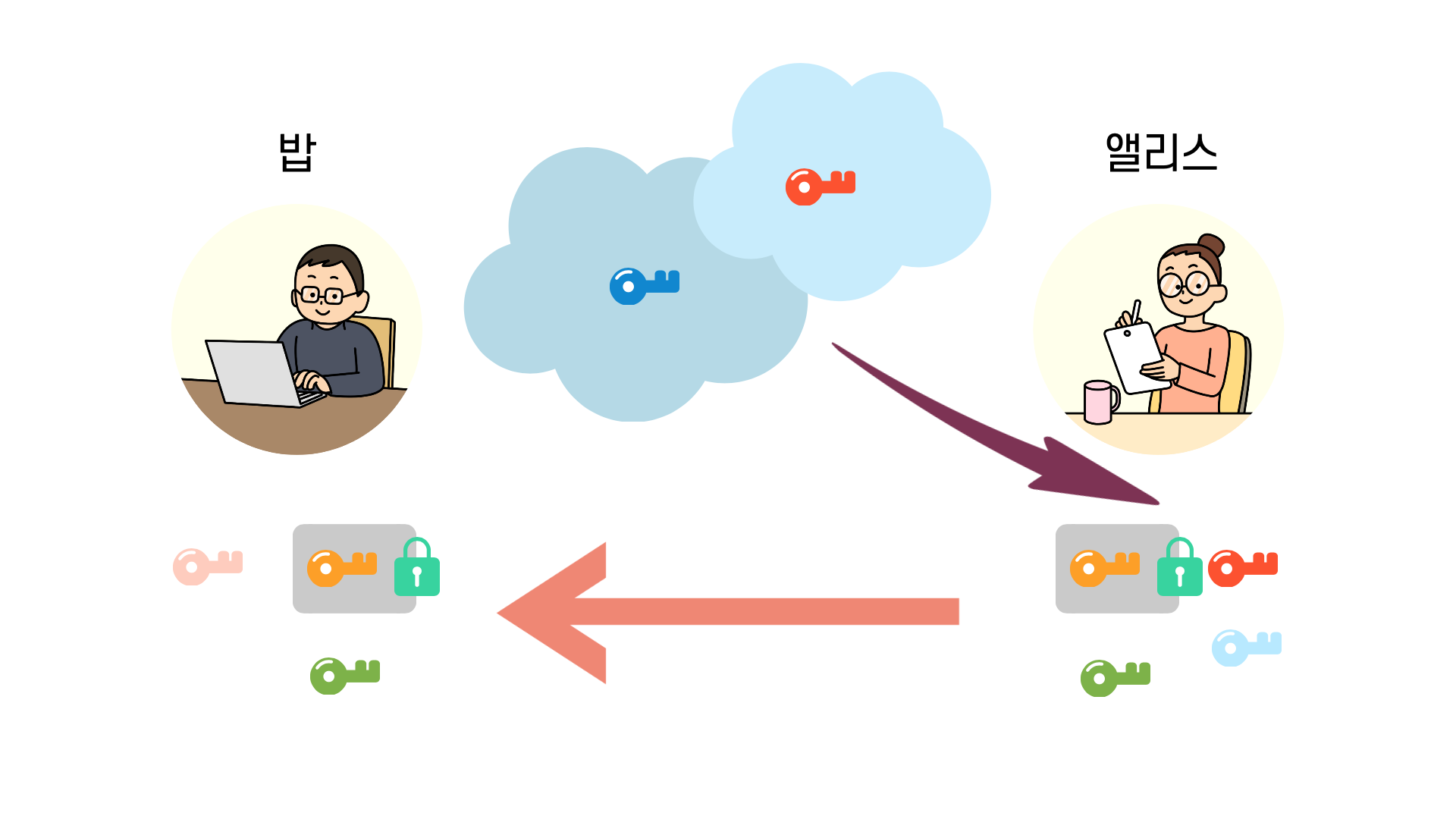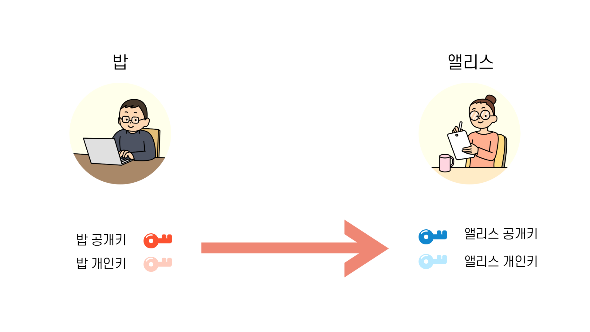 우선 밥과 앨리스는 각자 공개키와 개인키를 가지고 있습니다. 이때, 공개키는 오픈되어도 괜찮다고 말씀드렸었죠? 따라서 밥과 앨리스는 자신의 공개키를 오픈되어 있는 공간에 올려놓습니다. 이렇게 공개된 공개키는 아무나 가져갈 수 있게 됩니다.