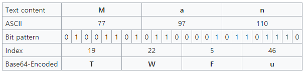 디코딩은 인코딩의 반대입니다. 위에서 예로 든 TWFu라는 값이 전달되면 Base64 디코딩을 해서 Man 값을 얻어냅니다. 디코딩 순서는 먼저 각 문자들을 2진수로 변환하고 다시 8bit 씩 끊어서 ASCII 값으로 바꿔주면 됩니다.