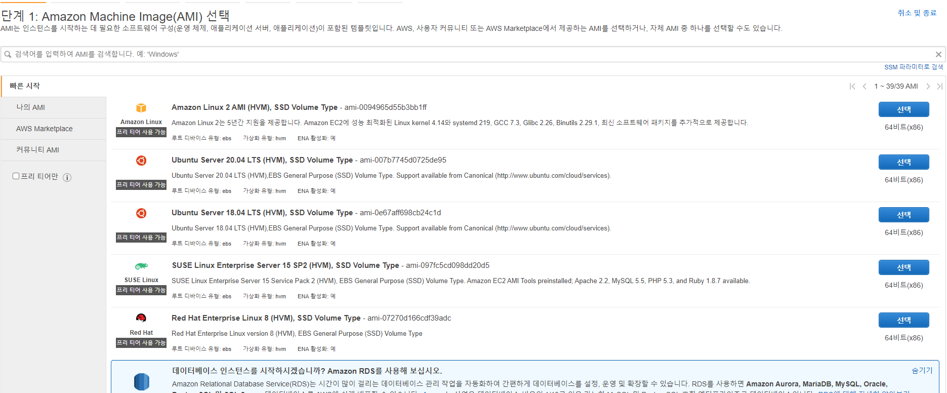 저는 Amazon Linux 2 AMI 를 선택해 보도록 하겠습니다.