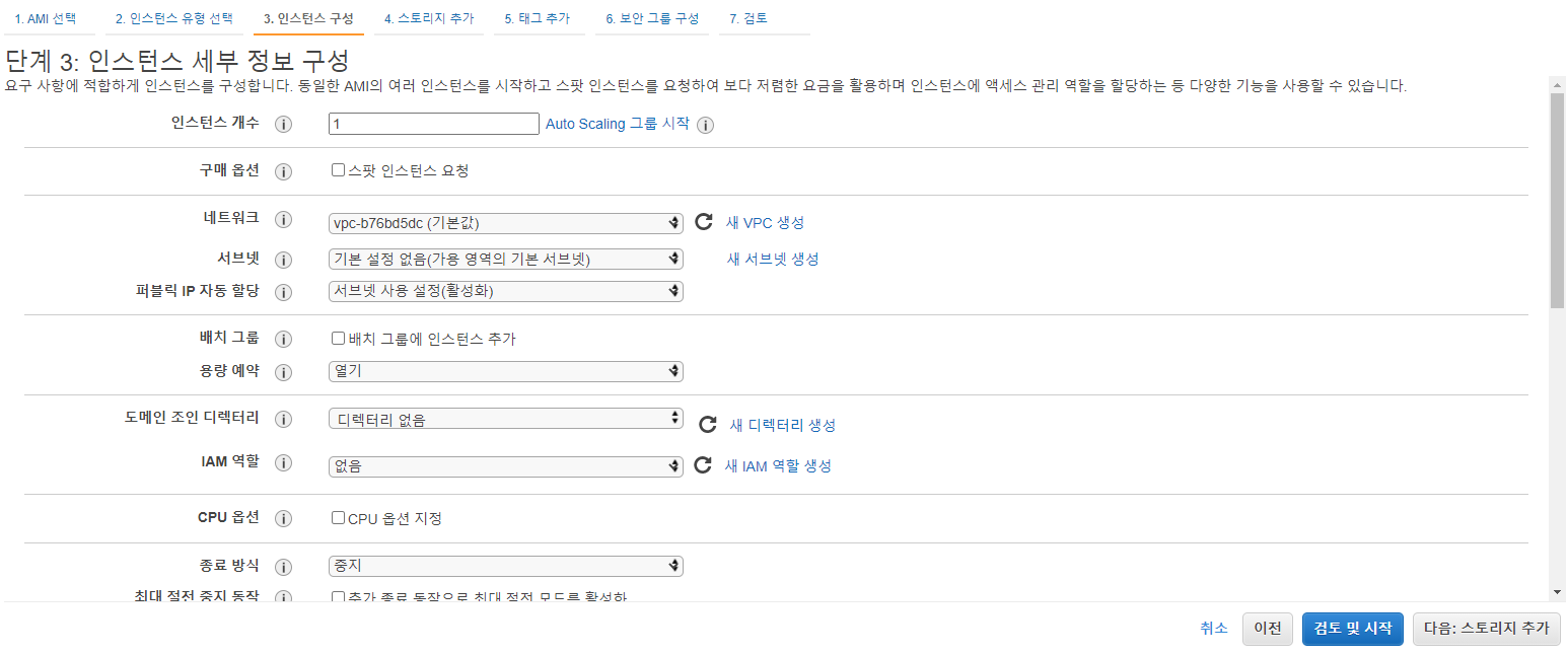 ▲ 단계 3에서는 앞선 단계 2에서 선택한 t2.micro 인스턴스의 세부 정보를 구성할 수 있습니다. 모두 기본으로 두고 다음 버튼을 눌러줍니다.