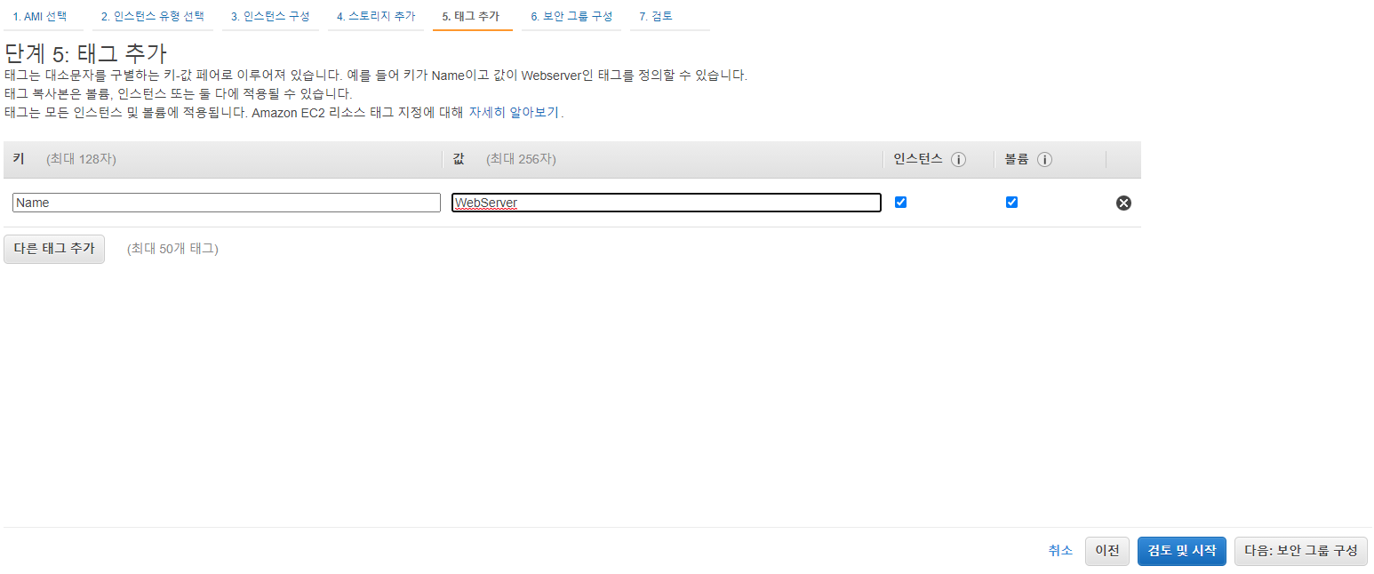 ▲ 단계 5에서는 태그를 추가하는 부분입니다. 설정 하셔도 되고 안 하셔도 되지만 저는 기본으로 똑같이 설정해 보았습니다. 다음 단계로 넘어갑니다.