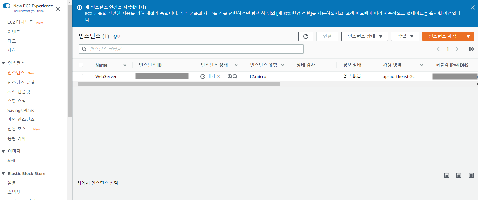 ▲ 앞서 정한 이름의 인스턴스의 상태를 볼 수 있습니다. 그리고 접근 가능한 퍼블릭 IP와 DNS주소도 있습니다. 이제 웹서버와 애플리케이션 서버를 설치해서 동작 여부를 확인할 수 있는 상태가 된 것입니다.