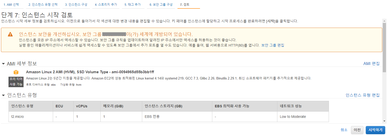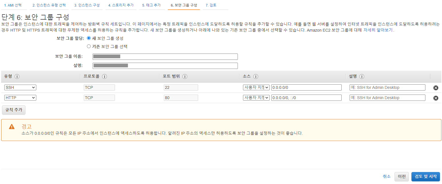 ▲ 단계 6에서는 보안 그룹을 구성하는 곳입니다. 그룹 이름과 설명은 임의로 작성하시면 됩니다. 여기서 보안 그룹은 어떤 포트를 열어줄것인지 설정하는 곳입니다. 예를 들어서 외부에서 SSH를 접속하고 싶을 때에는 22번 포트를, HTTP는 80번, HTTPS는 443번, 그리고 임의로 열고 싶은 포트는 열어 놓으면 그 포트로 서비스가 가능합니다.
