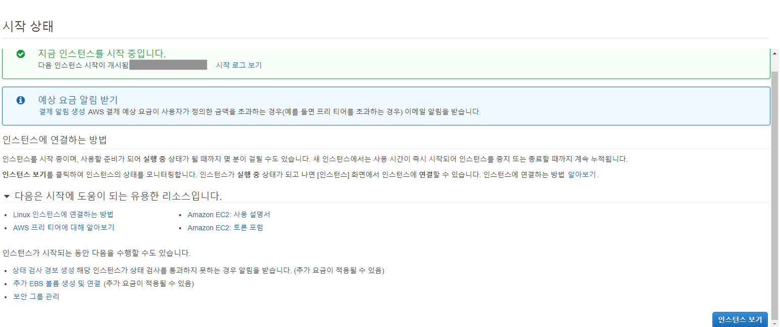 ▲ 인스턴스가 바로 시작되고 현재 인스턴스의 상태를 볼 수 있습니다. 인스턴스 보기 버튼을 클릭합니다.