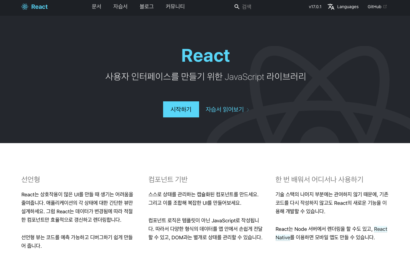 리액트 홈페이지 주소 : https://ko.reactjs.org