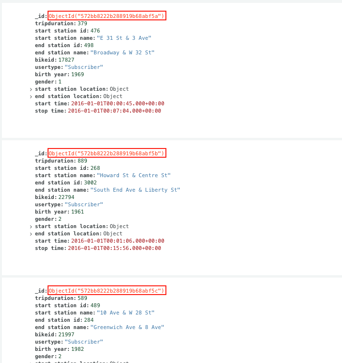 이제 이 값들을 불러와서 사용하는 경우가 있다면 다음과 같은 함수를 사용합니다. 이렇게 저장된 ObjectID는 원하는 데이터를 찾거나 업데이트, 혹은 삭제를 할때 이용될 수 있습니다. RDBMS에서 primary key와 같은 역할을 해주는 값입니다.