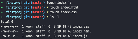 Linux 관련 명령어중 빈 파일을 생성해 주는 명령어는 touch 입니다. 이 명령어를 이용해서 파일 3개 (index.js, index.html, index.css)를 생성해 보도록 하겠습니다.